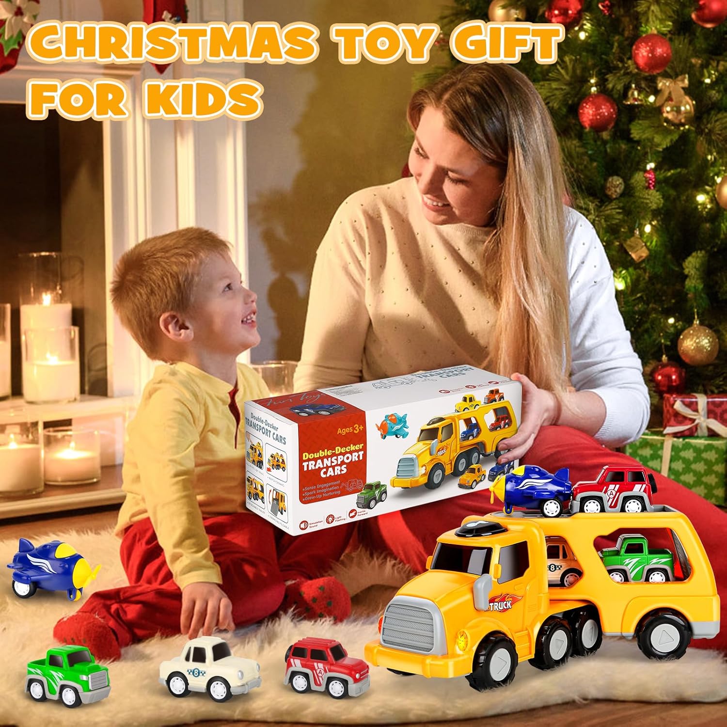 [5 in 1 Macchinine Giocattolo per Bambini] - Compreso un camion grande porta auto e 4 mini auto. Le mini auto sono veicoli da traino, tiralo indietro e correrà in avanti per una lunga distanza.